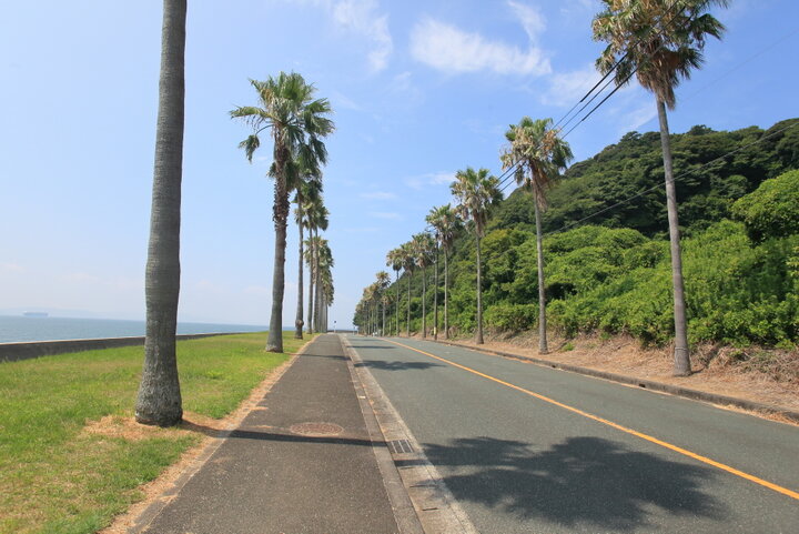 海沿いにヤシの木並木が続く、西浦シーサイドロード