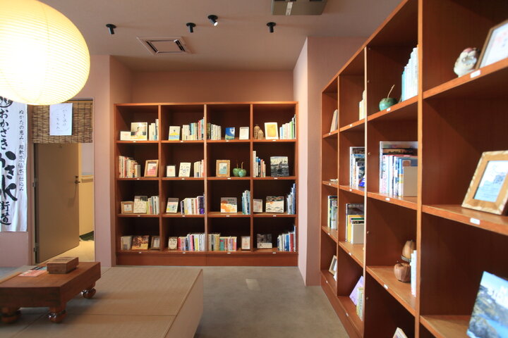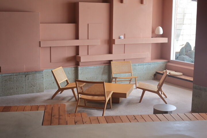 「温泉喫茶sinonome」は、「銀波荘」の大浴場をリノベーションして作り上げた憩いの空間。男湯と女湯に分かれていた大浴場がそれぞれ雰囲気の異なるカフェスペースになっていて、店名にもなっている東雲(しののめ)色で統一されています。脱衣所の棚は本を並べてライブラリースペースに。大浴場の間取りや設備をそのまま生かしたインテリアが特徴です。