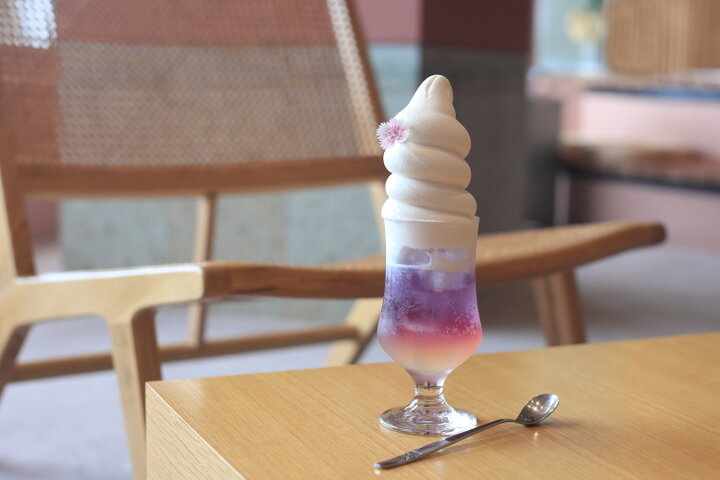 ここで楽しめるのはこの場所でしか楽しめないものをと作り上げたドリンクやスイーツ。なかでも名物は、グラデーションがきれいなクリームソーダ。店名の東雲とは、朝日が昇る頃の薄明るい東の空の様子を指す言葉で、夕焼けとはまた違った優しい空色。その色をクリームソーダで表現しました。桃とバタフライピーのシロップを使うことで色の変化も楽しめるようになっています。