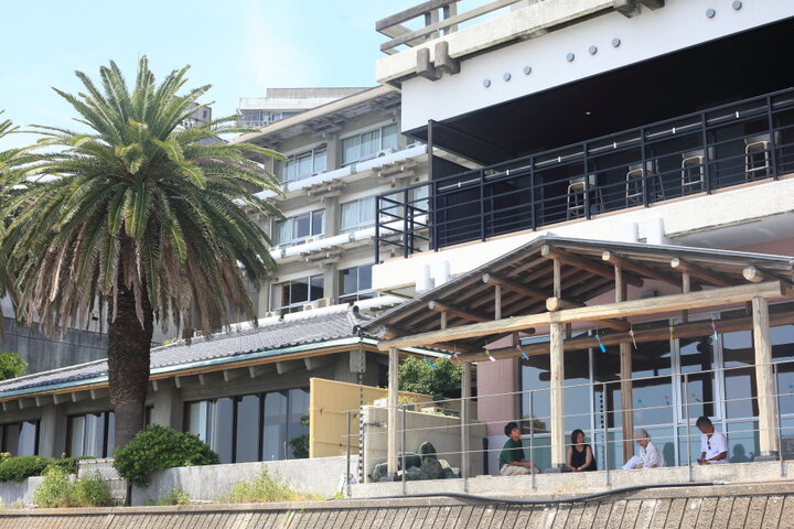 大浴場だった店内から外に出ると、露天風呂をリメイクした足湯があり、波音を聞きながらゆったり過ごすことができますよ。ここからそのまま海岸へと降りることもでき、海岸からお店に訪れる人も。ホテルの宿泊者はもちろん、誰でも気軽に立ち寄ることができるようになっています。