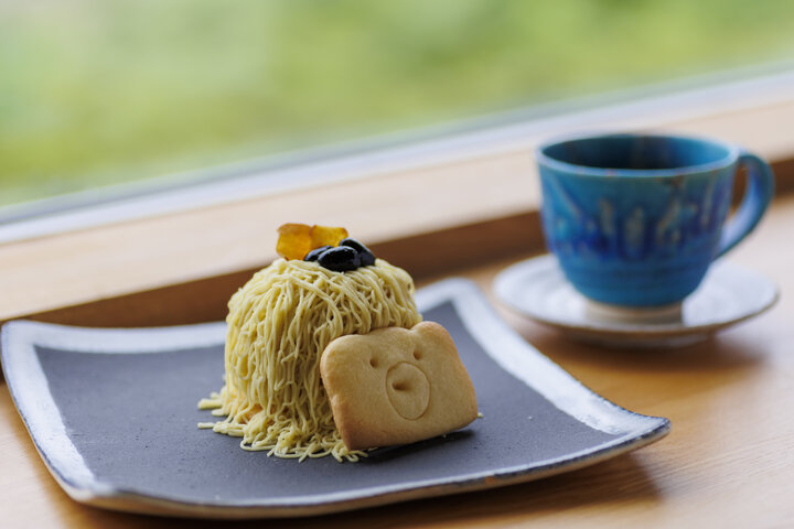 全国有数のやきものの里、滋賀県の信楽。町に点在する200軒ほどの窯元のひとつ、信楽陶苑が展開する「信楽陶苑たぬき村」敷地内の「aoikuma」は、倉庫をリノベーションしたおしゃれなカフェ。お芋のモンブランや焼き芋などお芋を使ったスイーツが信楽焼のうつわでいただけます。窓に映るせせらぎと竹林が織りなす自然豊かな風景を眺めながら、いつもよりゆったりと流れる時間が楽しめます。