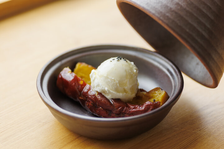 こちらは、焼き芋に、地元甲賀の成田牧場から届くフレッシュなバニラアイスクリームを添えた「手作り焼き芋~アイスクリーム添え」。夏の間は信楽焼のお皿にのせたひんやり冷たい焼き芋が、暖かさが恋しくなる秋から冬にかけては、信楽焼のタジン鍋に入ったホカホカの焼き芋が運ばれてきます。