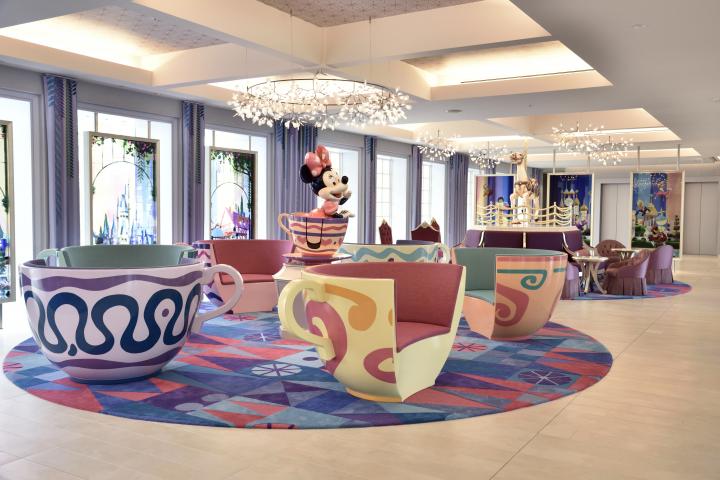 中央にいるミニーマウスと「アリスのティーパーティー」のティーカップをモチーフにしたソファ