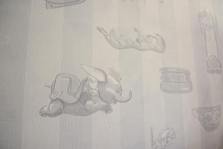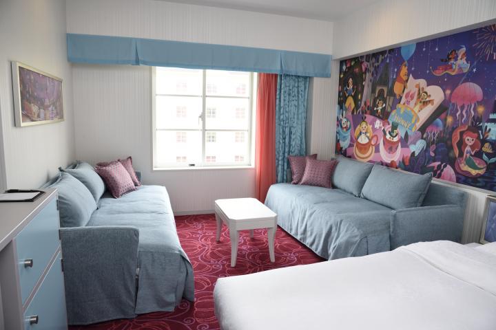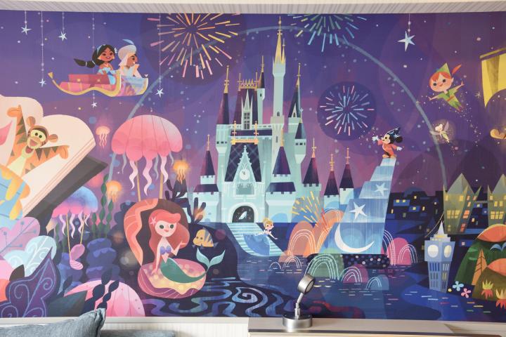 こちらは「“ウィッシュ”スタンダードルーム」。室内に入ってまず目に入るのは、壁一面に描かれたアート。ディズニーのキャラクターたちが、アトラクションで楽しむ様子が描かれているここだけのものです。シンデレラ城とシンデレラ、ファンタズミックのミッキーマウスなど、両パークの世界観が込められています。また、カーテンを閉め室内を暗くすることで、あっと驚くサプライズがあるので、宿泊時に確かめてくださいね。