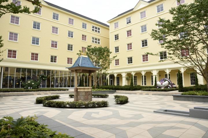 ロの字形になったホテルの中庭も注目。「東京ディズニーランド・エレクトリカルパレード・ドリームライツ」のフロートをイメージしたトピアリーが配され、散歩するだけでも楽しめます。中央には、白雪姫の願いの井戸があり、ここも人気の撮影スポットになりそう。願いが叶うジンクスでも有名ですね。夜はライトアップされ、パレードを見ている気分に浸れます。