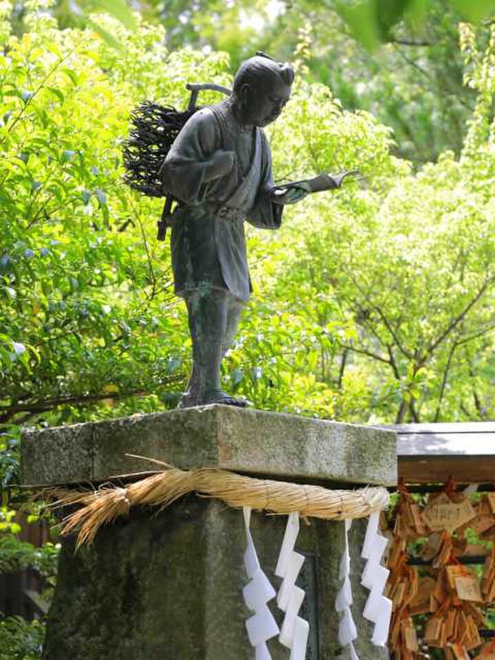薪を背負って読書する姿でおなじみ、二宮金次郎(尊徳翁の少年時代)の像。境内には尊徳翁の像もある