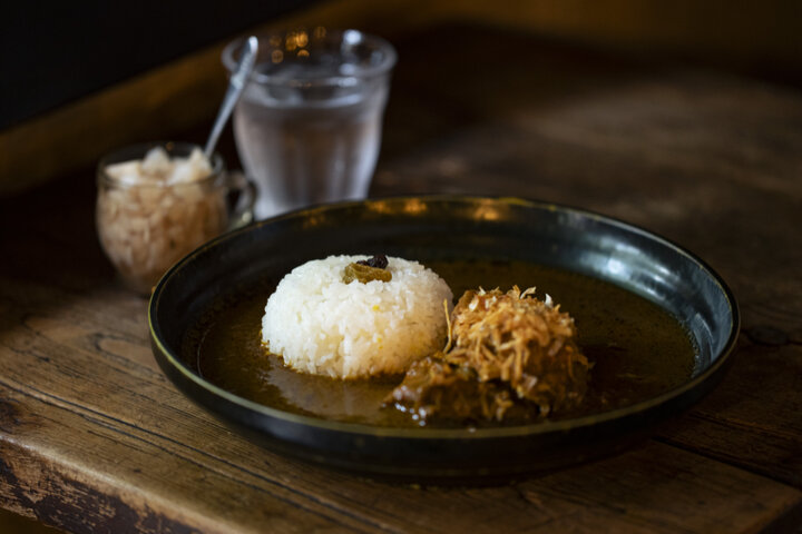名物は「スパイシーチキンカレー」。じっくり煮込まれた、思わず汗ばむ辛さのスパイスカレーです。たっぷりの玉ねぎを時間をかけてじっくりと炒め、各種スパイスをミックスしたシャープな辛みは、前店主のラビさんが長い間かけてようやくたどり着いた味なのだそう。柔らかく煮込まれた鳥もも肉の塊をスプーンでほぐしながらいただきましょう。