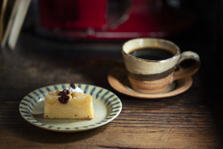「ホットコーヒー五番町」(650円)と「洋梨とチェリーのしっとりパウンドケーキ」(600円)