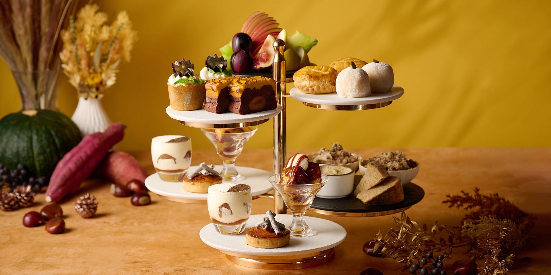 「芋栗かぼちゃ」をテーマに贈る、秋の香り漂う「実りの秋のアフタヌーンティー~芋栗かぼちゃ~」では、甘みを凝縮した焼き芋に、マスカルポーネとカスタードを重ねた濃厚な「焼き芋ブリュレタルト」、ほうじ茶のジュレとスポンジに自家製渋皮栗を贅沢に忍ばせた「マロンティラミス」、そしてやさしい甘みのかぼちゃ餡をふんわり包んだ「かぼちゃ大福」をはじめ、季節感あふれるラインアップを楽しむことができます。