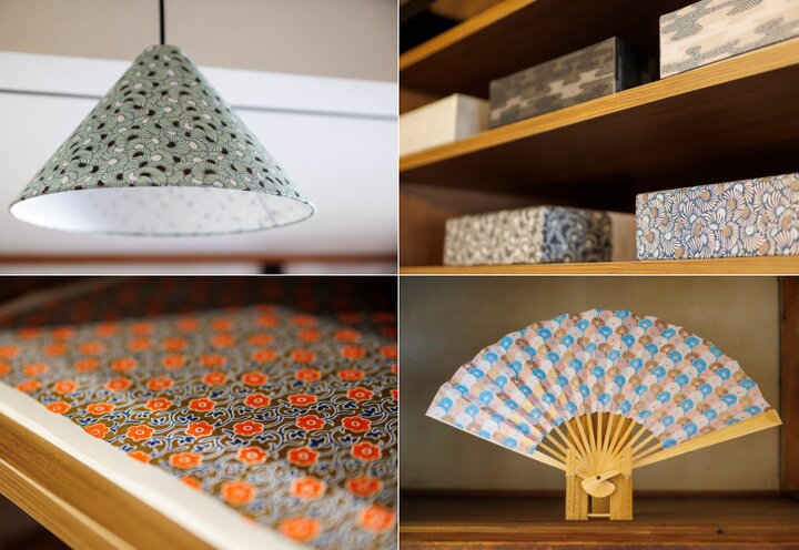 オリジナルデザインの和紙を使ったランプシェードや、扇子、紙箱なども