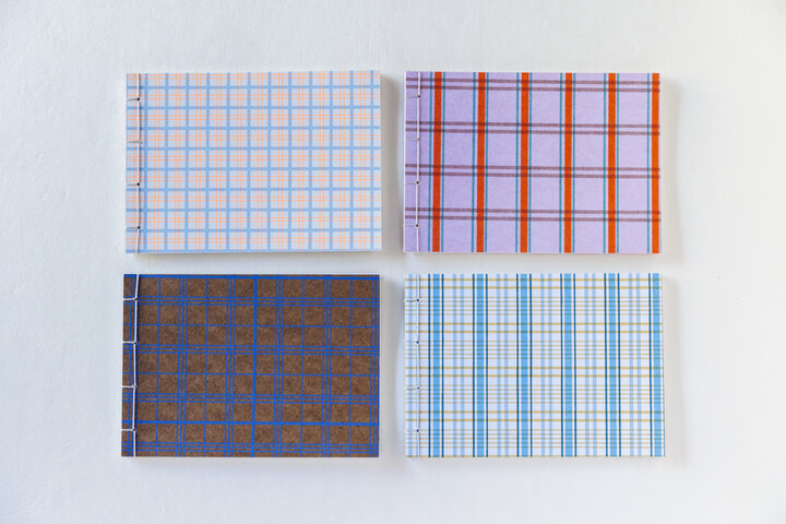 格子模様の「KŌSHI」シリーズより、麻糸を使った「和綴じメモ」(A6サイズ)各880円