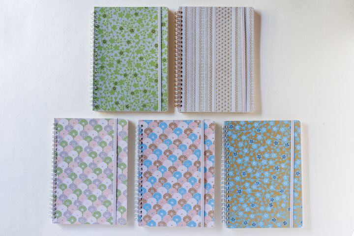 花柄・ドット柄・ストライプ柄をベースにした日本の紋様を、ブルーとゴールドを基調に仕上げた「TONE」シリーズのリングノート(A6)各1320円