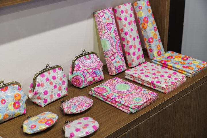 「デザイナーや職人たちとていねいにコミュニケーションを重ね、求めるイメージを形にしていきます。柄は100種近く。自分に合うものやスタイルを考えながら、見て、選ぶ楽しさを感じていただければうれしいですね」と二代目の松尾安浩さん。 古くから受け継がれてきた友禅和紙の版の中からセレクトしたクラシカルな伝統紋様をベースに、新たな色彩と感性を光らせリデザインを行なったものをはじめ、オリジナルシリーズは8種ほど。チェック柄として世界中で愛されてきた「格子紋様」がベースの「KŌSHI」、オリエンタルな気品漂うボタニカル柄を集めた「GARDEN」、手捺染だからこそ表現できるゴールドやシルバーのドットパターンを重ね合わせた「TWEED」などがあり、好みのシリーズに出会えます。