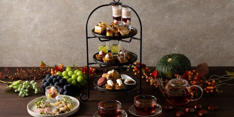 和栗とキャラメルナッツのプティガトー、和栗と柿のムース、和栗とレーズンのラップサンド、和栗を使用したパテ・ド・カンパーニュなどが味わえる「和栗と葡萄のアフタヌーンティー」は、和栗のまろやかな甘みと、葡萄のみずみずしい酸味が奏でる、秋限定のアフタヌーンティー。実りの季節ならではの、心華やぐティータイムを楽しむことができます。