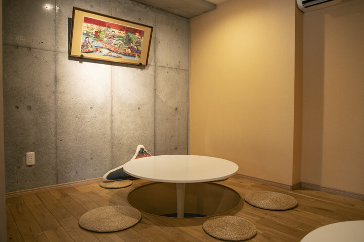 店名に合わせて、板間の小上りはテーブルもクッションもまんまる