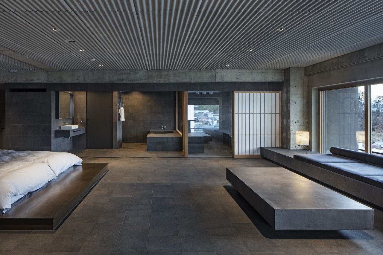 「豊かな知と出会う」をコンセプトにしたブックホテル「松本本箱」。源泉かけ流しの露天風呂が全室に付いているのは2つのホテル共通ですが、コンセプトとデザインは大きく異なります。本箱はデザイナーやプランナーなど、クリエイティブな職業に就く方々におすすめのホテル。寸分の隙もなくデザインされた「緊張感のある」空間です。設計は「ONOMICHI U2」や「hotel koé」などで知られる「SUPPOSE DESIGN OFFICE」。旧小柳の「記憶」を随所に残した、新旧のレイヤーを感じる空間を楽しむことができます。