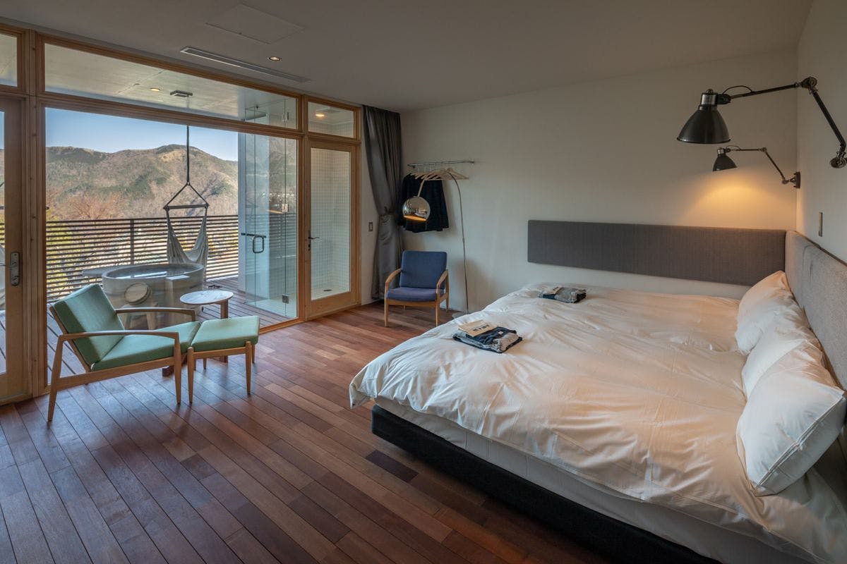 客室は18室。その全室に温泉露天風呂と「あの人の本箱」が付き、それぞれ異なるインテリア。1つとして同じ客室はありません。創造的思考を誘発する空間で、読書にふけるのはもちろん、自分の思考を整理したり、企画書を書いたり、何もしないでぼーっと過ごしたり。思い思いの時間を過ごすことができます。