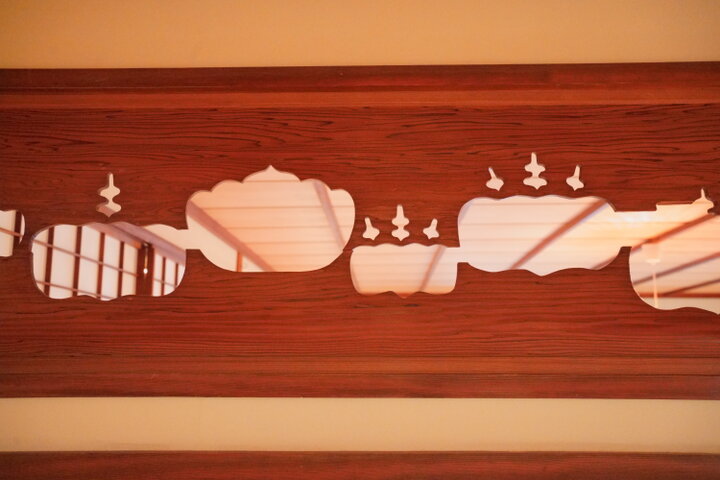 河崎町に残る裏千家の格式高い茶室の欄間が再現されていて、町の歴史もうかがい知れます