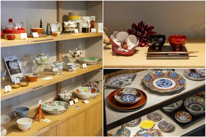 個性豊かな器の数々。九谷焼の多彩な魅力に触れられるコーナーや漆器のコーナーも