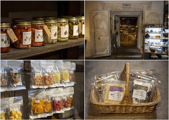 店内には蔵がそのまま残っており、中には保存食の専門店「stoock」もあり、地元でも人気です。規格外の旬の野菜を使い、安心・安全にもこだわった「金沢ピクルス」をはじめ、ジャムやドライフルーツ、ソーセージ、燻製など、日持ちするのはもちろん、食事の時間が楽しみになるようなラインナップがそろいます。北陸のおいしいものがぎゅっと詰まっていますよ。