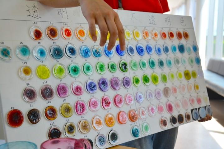 今回は7月15日までの期間限定「八尾和紙を使ったガラス風鈴づくり」(3100円)を体験してきました。 ガラス風鈴といっても、形も色もさまざま。まずはガラス作家さんと相談しながら、形を決めていきます。装飾する柄は、水玉、マーブル、気泡などの中から好きなものを選ぶことができますよ。 さらに、富山の伝統工芸である八尾和紙で作られた短冊も、数種類から選びます。こちらの短冊は、八尾和紙の老舗「桂樹舎」の手漉き手染めによるもの。 どの柄も魅力的とあって迷ってしまいます。作家さんいわく、直感が大事なんだとか。