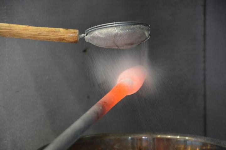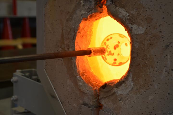 制作する風鈴のイメージが決まったら、いよいよ制作スタート。 まずは、溶解炉の中から、吹き竿の先にガラスを巻き取り、高温の釜の中で焼いていきます。