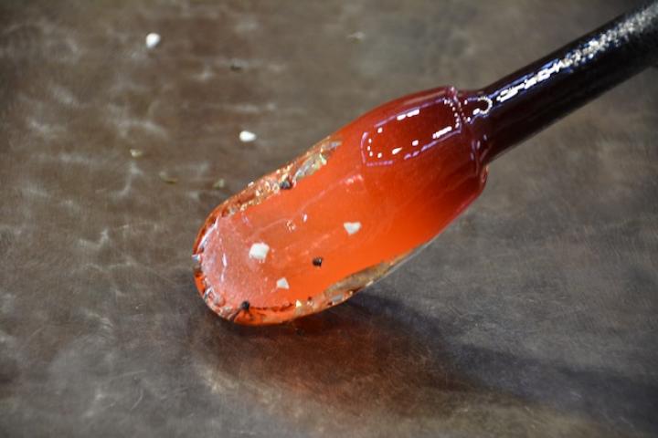 ある程度形が整ってきたら、色と柄をつけます。細かいカラーガラスの粉を振りかけていきます。この時、ガラスが固まってしまわないように、クルクルと竿を回し続けるのがポイント。再び焼き付けたあとは、水玉模様や気泡をつけます。水玉模様も、カラーガラスの粒をクルクルと回し付けていきます。そして再び、高温の釜の中へ。