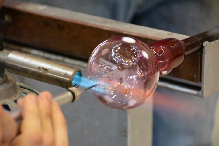 最後に、吹き竿からポンテ竿に付け替え、風鈴の糸を通す穴をバーナーで焼きながら開けていきます。穴が開いたら、ジャックで広げていきます。ガラスが割れないように、そーっと力を入れるのがポイントです。作家さんが丁寧に教えてくださるので、その通りに力を入れたりゆるめたりしながら、完成までもう少し。
