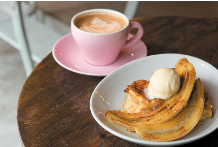 ベイクドバナナフレンチトースト(750円)と、ラテアートを施したカフェラテ(400円)