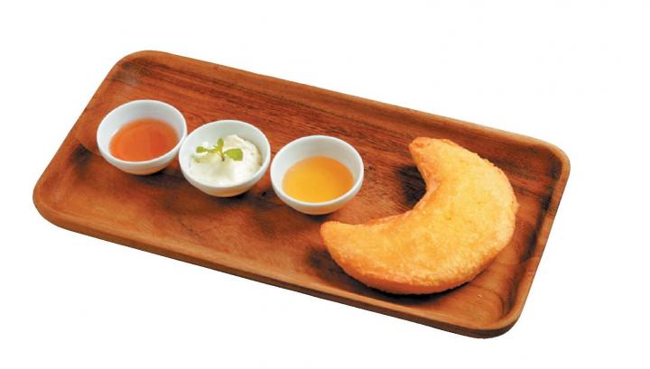 月のレモンケーキ(700円)。し っとりした三日月形ケーキに3種のソースをつけて味わう