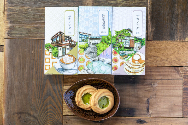 宿泊するとウェルカムスイーツのクッキーが部屋にあり、これはお土産として販売をしています。地元のイラストレーター・鴨志田和泉さんのパッケージデザインが目を引くオリジナルのお菓子で、系列店の鎌倉にある古民家カフェ「ユキノシタ」と「サカノシタ」をモチーフにした3種類。大きなクッキーが入っていて、旅の思い出をそっと包み込むようなやさしい甘さ。阿部倉温泉で過ごしたひとときを思い返しながら、お家でもほっとひと息つけるお土産です。