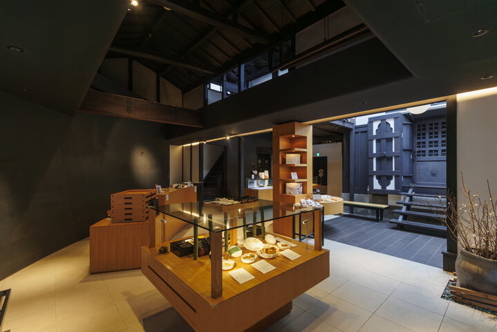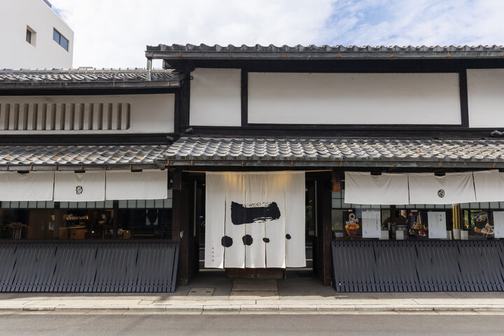 地下鉄の烏丸線と東西線が交差する烏丸御池駅から室町通を上がること6分ほど。白壁に虫籠窓、端正な一文字瓦を冠した大きな京町家が現れます。築300年超、元は呉服商だったという建物が、創業100年の長﨑堂が手がける菓子司「然花抄院」の本店です。店名には「花ある心でもてなし、お菓子本来の味を楽しんでほしい」という想いを込めているそう。