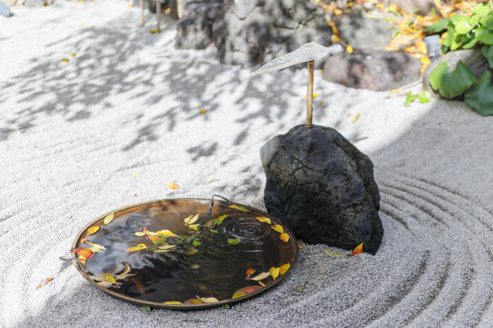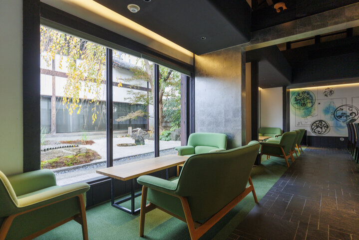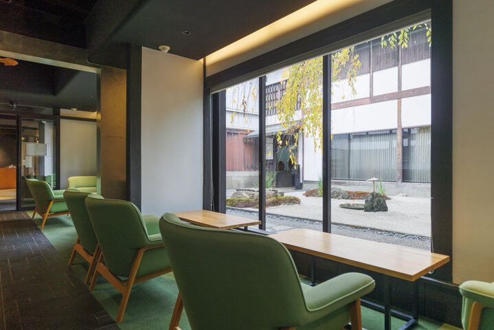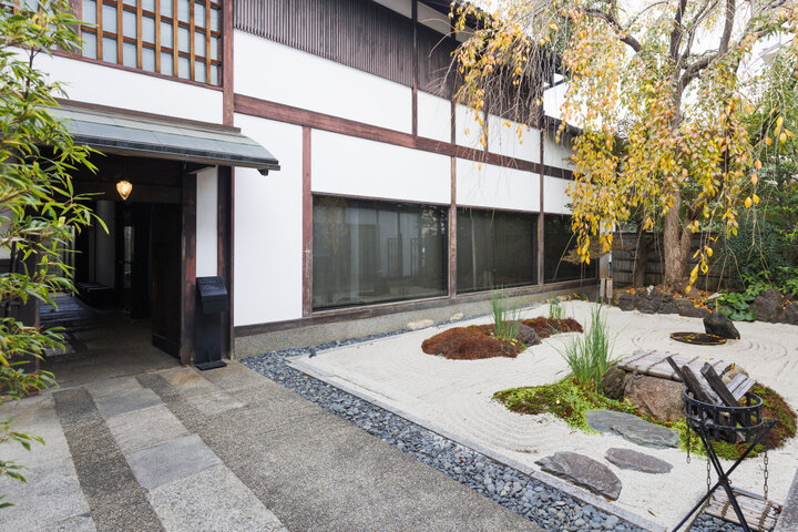 光が創り出す陰影が美しい空間は、どこに目を向けても絵になります。古い柱、台所のおくどさん(かまど)、石畳、かつて京都の街なかを走っていたちんちん電車の敷石など、随所に残された意匠がこの建物が紡いできた時の流れを物語ります。 見どころのひとつである坪庭は、一滴の雫が静かに広がっていくような砂紋を描く枯山水庭園。大きなしだれ桜の木は、京都の桜を象徴する円山公園のしだれ桜の孫にあたります。