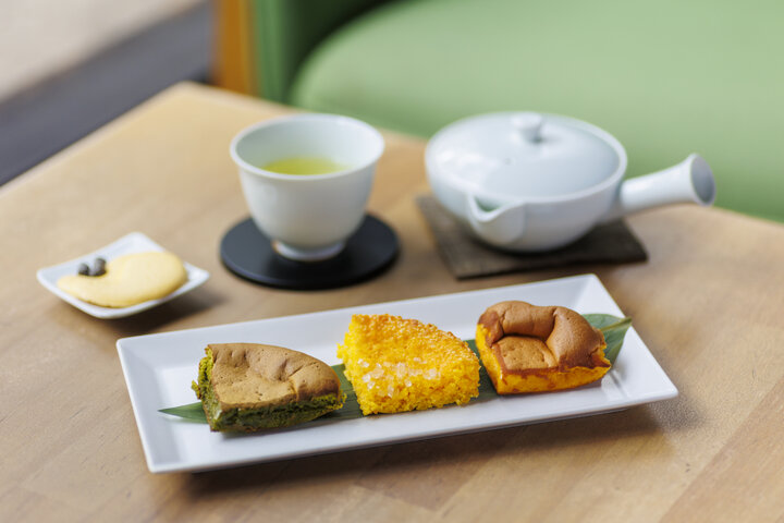一年を通して味わえるのは、「茶庭ノ膳」。毎日工房で焼き上げる代表銘菓の紙焼きカステラ「然」かすてらのシリーズ3種が食べ比べできます。「然」かすてらのほか、濃厚な黄身をほろほろとほどける食感に仕上げた「卵蜜」、京都産宇治抹茶を織り交ぜた「碾」の3種で、同じ生地を使って勾玉の形に焼き上げた「室町傍瑠(ぼうる)」と箸やすめの山椒風味の塩昆布「玉しぐれ」が付いています。