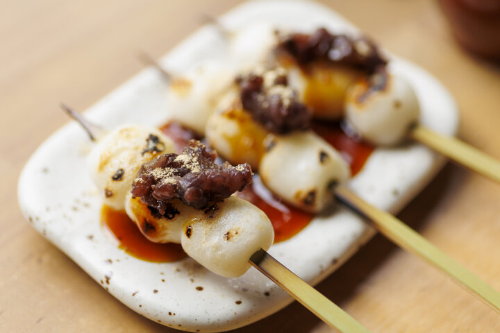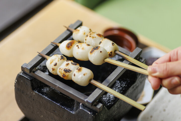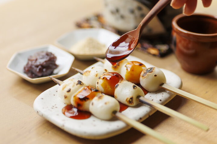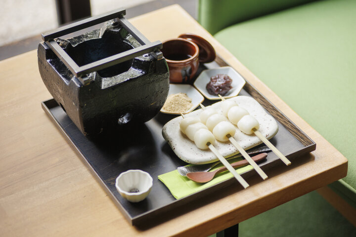 11月から5月下旬までの予定で提供される「やきたて みたらし団子」は、目の前で自分好みの加減に焼き上げるのが楽しいひと品。表面はパリッと香ばしく中はモチッとした、できたてのいちばんおいしい瞬間が味わえます。きつね色のほどよい焼き目をつけたら、みたらしダレ、粒餡、きなこをお好みでかけて。