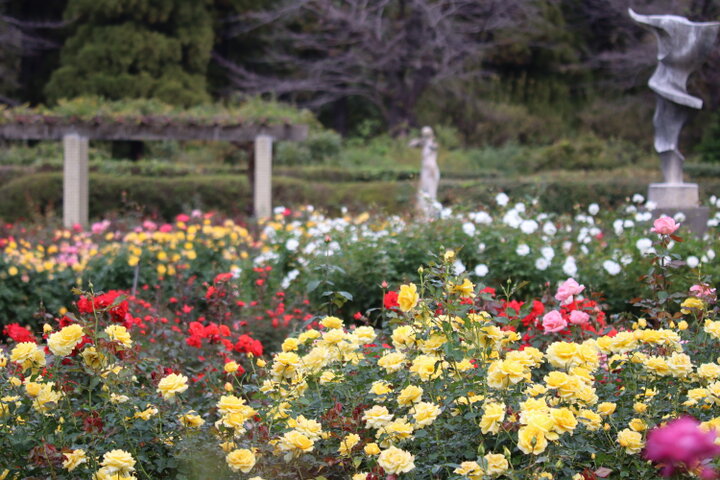 シンメトリーな沈床式庭園が美しい「ばら園」もぜひ足を運んでみましょう。世界でお墨付きをもらった「殿堂入りのバラ」をはじめ、約400種類・5200株のばらが一面に咲き誇ります。 こちらの庭園は、世界40か国のバラ会が加盟する「世界バラ会連合」が贈る「世界バラ会連合優秀庭園賞」も受賞しています。庭園の中央には巨大な噴水があり、こちらも見ごたえたっぷり。公園の一角に作られたベンチが並ぶ空間「ばら園テラス」からの眺めは圧巻です。