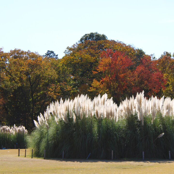 芝生広場の中央にある圧巻のパンパスグラス
