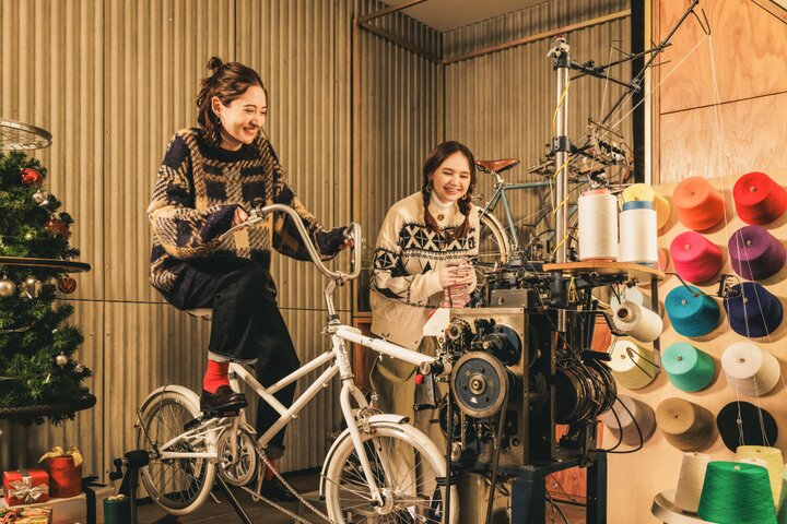 今年も自転車をこいで靴下をつくるマシーン「チャリックス by SOUKI」が「TAMARIBA」に登場。「チャリックス」は、今は使われなくなった靴下の編機をアップサイクルし、自転車と融合させた機械です。機械だけではなく、靴下を編む糸もアップサイクルで染められたものを使用します。完成した靴下を寝る前にドアノブにかけて眠りにつくと、翌朝サンタさんからささやかなプレゼントが届いているかも...?