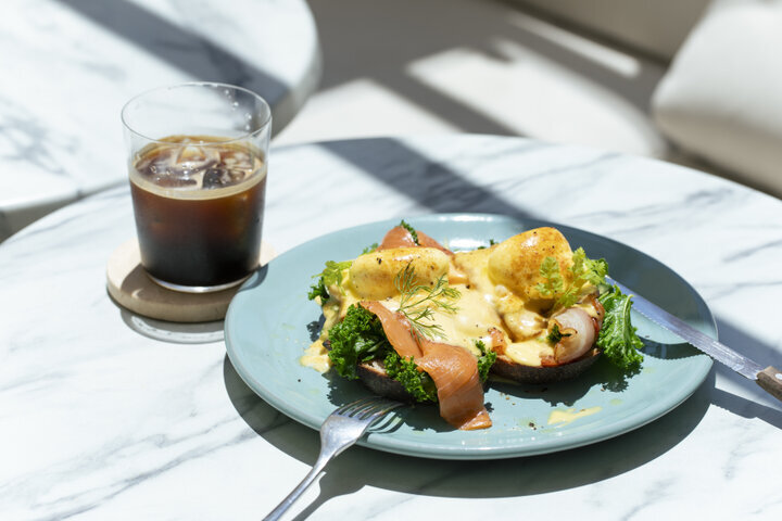 モーニングの「エッグベネディクト」は、華やかな見た目と洗練された味わいに心も弾む一皿です。自家製カンパーニュの上に、半熟卵のとろりとした黄身と、ベーコンやケールをはじめとした新鮮野菜、オランデーズソースが重なります。有機小麦やスペルト小麦を使い、じっくり発酵させて焼き上げたパンは、外は香ばしく、中はもっちり。リゾートのような開放感と、鎌倉のやわらかな朝が心に残ります。