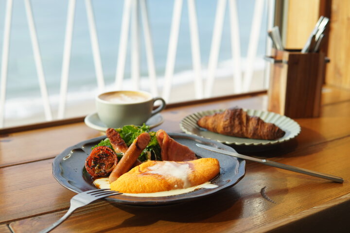 モーニングの「七里ガ浜オムレツプレート」は、濃厚な卵を使ったふんわりオムレツに、デミグラスとチーズソースの2種類がかかりソーセージと野菜を添えた一皿。さらに、このモーニングタイムにだけ提供される自家製のクロワッサンがセットになり、サクサクとした食感とバターの香りで、海辺の朝がより豊かになります。