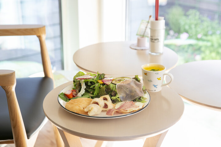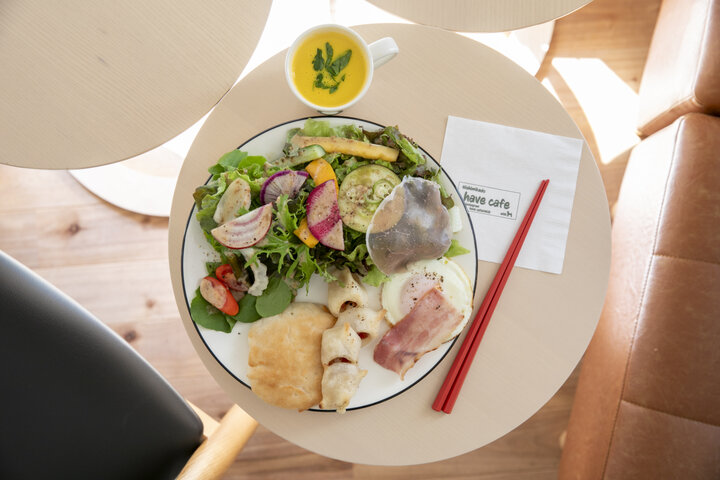白壁と無垢の木が調和する北欧風の空間が広がる「Nishimikado have café(ニシミカド ハブカフェ)」は、自然のあたたかさに包まれながら過ごせるモーニングが人気です。「米粉丸パンプレート」は、米粉で焼いた自家製の丸パンに、目玉焼きとスープ、そしてたっぷりの新鮮な鎌倉野菜が添えられるのが魅力。