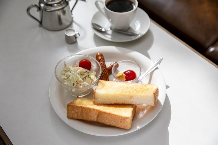 奥行きのある店内の窓辺には明るい光が差し込み、手入れの行き届いた庭園を眺めながら、心地よく過ごせます。モーニングは厚切りトーストとコールスローサラダ、ソーセージといった、飾らないシンプルな一皿。伝統のスタイルをいただく朝食は、まるで古き良き時代へタイムスリップしたかのよう。