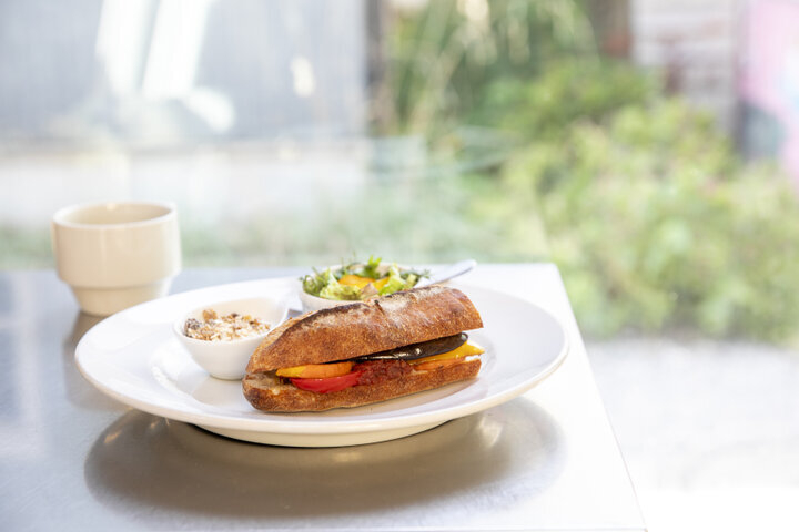 こだわりの食材は、主に有機栽培で育てられたものを使い、自然な美味しさを味わうことができるのが魅力です。モーニングの「サンドイッチ」には有機天然酵母の無添加パンを使い、地元の鎌倉野菜を使ったデリを丁寧にサンドします。ヨーグルトとグリーンサラダが添えられバランスのいい一皿。有機栽培のコーヒー豆で淹れるコーヒーとともに、のんびりとした長谷の朝を楽しんで。