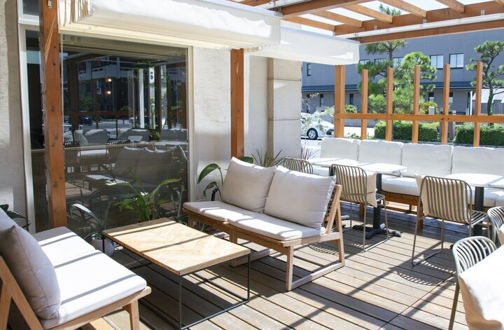 ウッドデッキのテラス席が印象的な「WOODBERRY COFFEE鎌倉店」。ふかふかのソファに腰を下ろせば、ほっと心がほどけていくようです。日差しの強い時間帯は、天井のシェードが柔らかな影をつくり、潮風を感じながらのんびりと過ごせるカフェです。