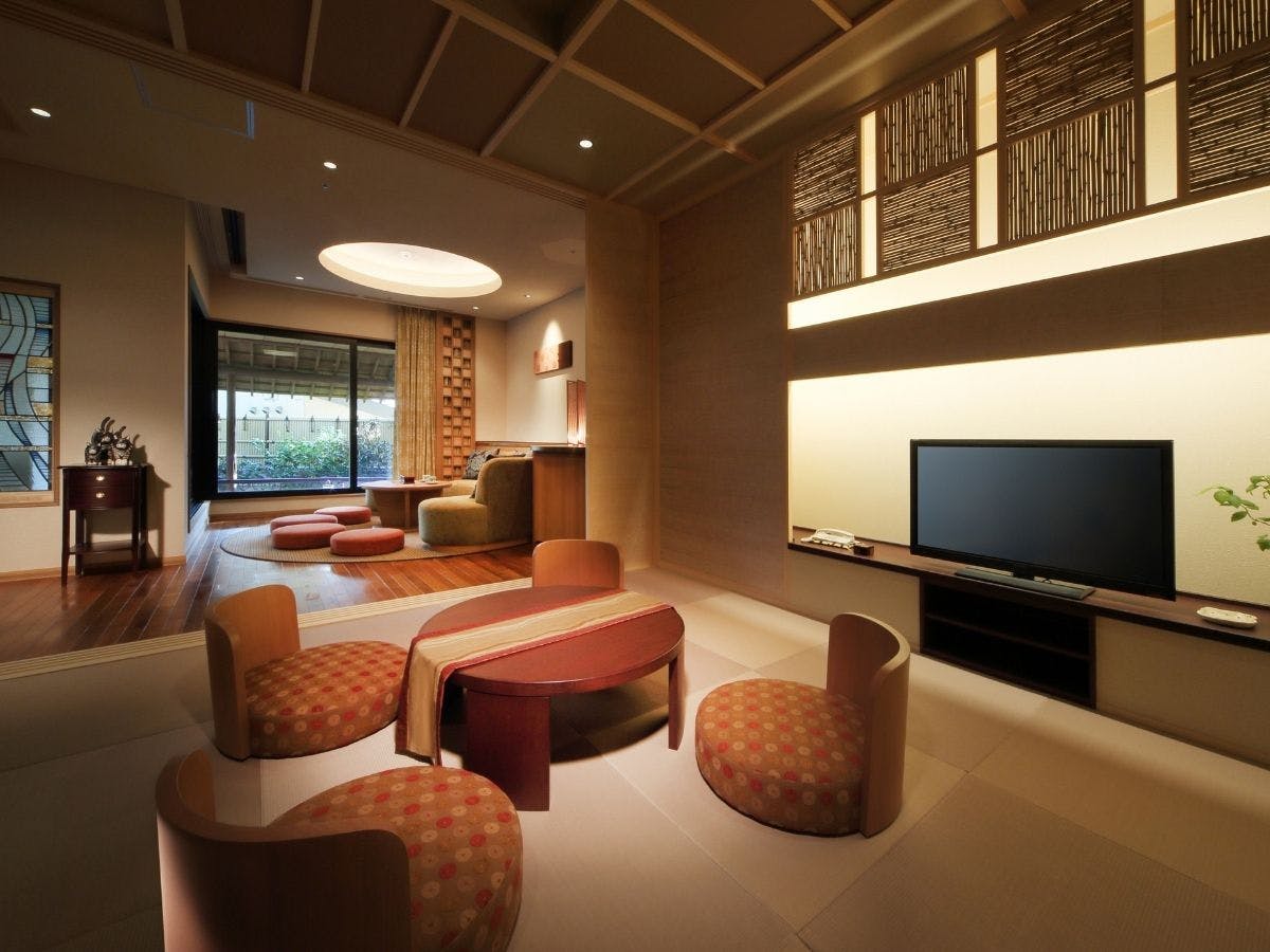客室はツインと和洋室の2タイプから選ぶことができます。さらなる広がりを追求した居住空間に加え、すべての客室にはプライベートテラスとして楽しめる空間を用意。さらに、すべての客室に鬼怒川渓谷を間近に感じられる温泉露天風呂が備えられています。
