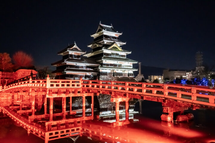 松本城公園では「国宝 松本城天守 プロジェクションマッピング 2025-2026」を、2025年12月13日(土)~2026年2月15日(日)の期間開催しています。 現存国宝5天守の一つで五重六階の天守の中で最古の国宝 松本城の天守や石垣に、松本市立博物館所蔵の商都松本が描かれた錦絵、絢爛豪華な屏風絵、松本てまりや提灯など松本市ならではの伝統工芸のモチーフ、春に咲き誇る桜や北アルプスの花々など、ダイナミックで幻想的なプロジェクションマッピング映像を投影します。 さらに、園路でのインタラクティブコンテンツ、城門でのプロジェクションマッピング、松本城公園のライトアップなど、さまざまな光のアートを体験することができます。