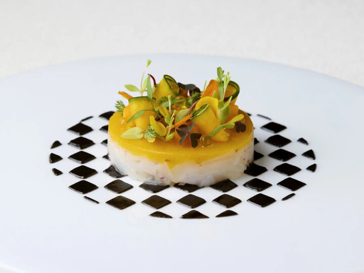 コラボレーションメニュー:リーガロイヤルホテル大阪 ヴィニェット コレクション「THE RAY」、ライム香る烏賊のタルタル バターナッツと鰹節の出会い(ランチコース「クロレ」の一品)、販売期間:2025年10月2日(木)~2026年2月2日(月)、除外日:2025年12月18日(木)~25日(木)、12月31日(水)~2026年1月4日(日)