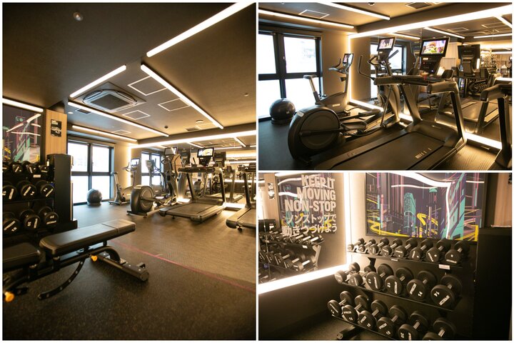 2階には24時間利用できるジムがあります。日本ではめずらしい、外資系ホテルならではの設備にワクワク。早朝から、外国人のゲストが汗を流しているといいます。ランニングマシーンのほか、ウェイトやヨガマットもあり、小さいながらも本格派。少し照明を落とした暗めの空間で、ワークアウトに集中できます。