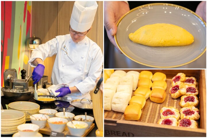 ビュッフェの一角にあるライブステーションでは、シェフが目の前でオムレツを仕上げてくれます。チーズやきのこ、トマト、オニオンなどトッピングもいろいろ。種類も豊富なパンと一緒に、できたてふわふわのオムレツをぜひ味わってみてくださいね。 贅沢なモーニングでエネルギーを充填して、今日の旅へと気持ちよく出発しましょう。