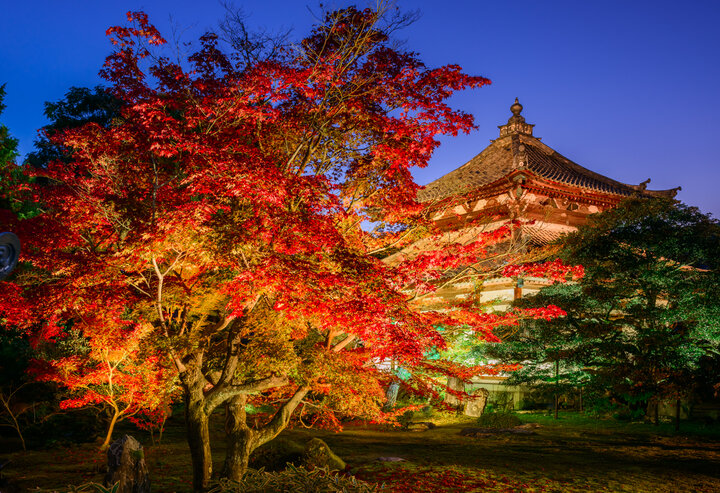 鹿王院は、足利義満が創建し、京都十刹第五位の格式を誇ったものの、応仁・文明の乱で焼失した宝幢禅寺の中で唯一再建された塔頭という、洛西屈指の古刹・名刹です。嵐山を借景とする日本最初の平庭式の枯山水庭園は、京都市指定名勝。山門から中門に続く石畳の参道とともに、知る人ぞ知る紅葉の名所です。 11月21日(金)からは、夜間特別拝観を実施。禅寺の魅力そのものを生かした格調高いライトアップは昨年度満員御礼。山門から続く印象的な石畳の参道や、嵐山を借景とする日本最初の平庭式の枯山水庭園が訪れる人を魅了しています。